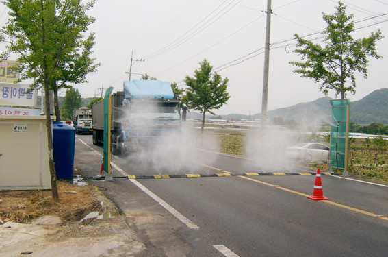 ↑↑ ▲오수동에서 설치된 무인차량소독기에서 소독약을 내뿜고 있다.
