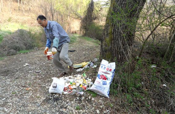 봄철이 되면서 지역의 각 저수지마다 쓰레기로 몸살을 앓고 있다. 최근 주말에는 인근 도시의 낚시인들이 지역의 저수지를 찾아 무분별하게 버리고 간 쓰레기가 환경오염의 주범으로 자리잡고 있다. 사진은 지난 3월30일 대창면 용전리 본촌지에서 15명의 낚시인들이 1박을 하면서 버리고 간 쓰레기를 이곳 주민이 수거하는 모습이다.
