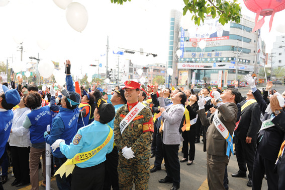 6·4지방선거를 앞두고 공명선거 분위기를 만들기 위해 모든 시민들이 손을 잡았다. 영천경찰서는 지난 16일 시청오거리에서 지역 기관단체·협력단체·시민단체 등이 참석한 가운데 공명선거 홍보캠페인을 전개하고 풍선날리기 퍼포먼스를 하고 있다.