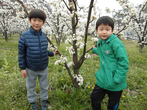 ↑↑ 배 생산지 삼호리 배밭에서 초등생 대원 박지성(좌)·박경호