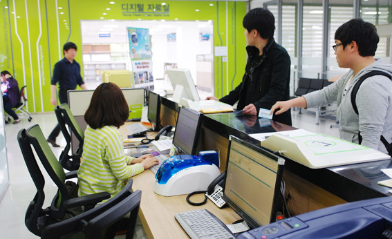 | | | ↑↑ 도서대출회원증을 발급해주는 안내데스크 | | ⓒ 영천시민뉴스 | | 구 회원증을 가진 시민들도 일단은 새로운 카드를 발급받아야만 한다. 2층에 있는 안내데스크로 가서 신분증(학생증, 재직증명서)을 제출하면 1분 안에 OK, 회원번호가 적힌 플라스틱 회원증과 비밀번호를 부여받게 된다. 도서대출회원증이 있으면 당장 도서를 대출할 수 있다. 한번에 5권, 대출기간은 14일이다. 종전보다 권수도 기간도 배로 늘은 셈이다.