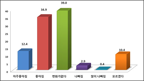 ‘변화가 없다’고 답변한 지역은 화남면(74.4%), 서부동(59%), 동부동(52%), 완산동(51.3%) 순으로 인구가 밀집한 시내지역에서 많은 사람들이 응답했다. ‘나빠진다’고 답변한 지역은 대부분 적은 편이나 중앙동이 유일하게 14.9%로 두 자리 수를 기록했다. 성별로 보면 남성의 경우 ‘변화가 없다’가 41.8%로 가장 높았고 ‘좋아진다’가 31.8%, ‘아주 좋아진다’가 15.3% 순이다. 여성은 ‘좋아진다’가 37.9%, ‘변화가 없다’가 36.1%. ‘모르겠다’가 12.9%로 나타났다. 연령별 보면 ‘아주 좋아진다’는 60대가 16.7%, ‘좋아진다’는 40대가 49.3%, ‘변화가 없다’는 20대가 54%, ‘나빠진다’는 40대가 7.6%로 가장 높게 나타났다.