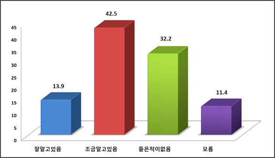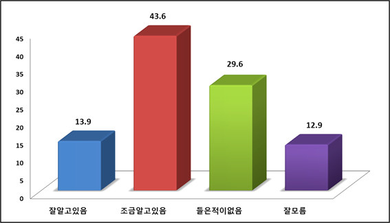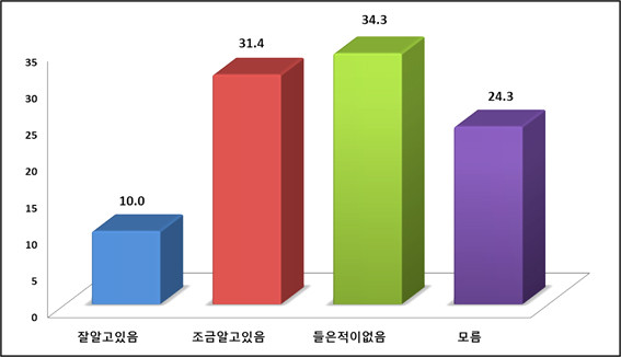 성별로 보면 남성의 경우 ‘들은 적이 없다’라는 답변이 38.4%, ‘조금 알고 있다’가 38.3%로 거의 똑같았다. 여성의 경우 ‘조금 알고 있다’가 46.6%, ‘들은 적이 없다’가 25.9%, ‘모르겠다’가 14.7%로 나타났다. 연령대로 보면 ‘잘 알고 있다’는 30대가 21.2%로 가장 많이 알고 있으며 60대(8.6%)를 제외하고는 고른 분포도를 보였다. ‘조금 알고 있다’는 20대가 60.5%로 가장 높았고 ‘들은 적이 없다’는 전체 연령에서 20~30%대로 나타났다.