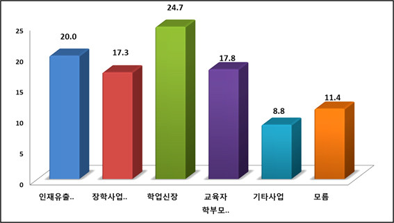 ① 인재유출방지 ② 장학사업 확대 ③ 학업신장 ④ 교육자 및 학부모 의식개혁 ⑤기타사업 ⑥ 모르겠다