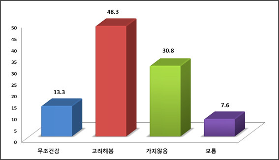 성별로 보면 남성은 ‘고려해 보겠다’가 51.3%, ‘가지 않겠다’가 29.2%, 여성은 ‘고려해 보겠다’가 45.1%, ‘가지 않겠다’가 32.4%로 남녀가 비슷한 생각을 하고 있는 것으로 분석됐다. 연령별로는 20대는 ‘고려해 보겠다’(57.2%), ‘무조건 가겠다’(25%)로 가장 높았고 30대는 ‘고려해 보겠다’(60.8%), ‘가지 않겠다’(27.2%)이며 40대는 ‘고려해 보겠다’(49.7%), ‘가지 않겠다’(24.1%)이고 50대는 ‘고려해 보겠다’(46.4%), ‘가지 않겠다’(35.8%)이다. 60대는 ‘고려해 보겠다’(40.3%), ‘가지 않겠다’(37.5%)이다.