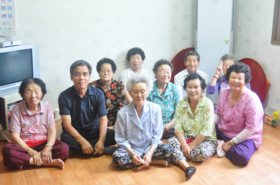 ↑↑ 이학래 이장과 마을 어르신들이 취재 후 기념촬영을 하는 모습.