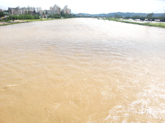 지난 21일 오전 영동교 금호강이 폭우 등으로 물이 불어나 모처럼 큰물을 형성하며 내려가고 있다. 물 구경 나온 시민들의 마음도 편안하고 넉넉해 보여 풍성한 가을을 예상하는 듯 했다.