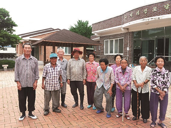↑↑ 박홍식 이장(맨 좌측)과 주민들이 경로당 앞에서 기념촬영을 하고 있다.