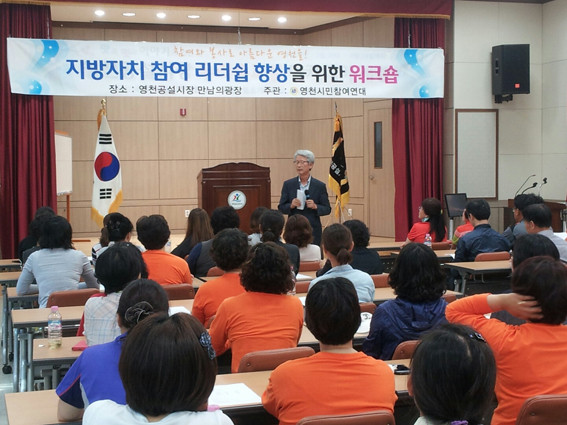 영천시민참여연대(회장 김영우)는 지난 21일 오전 공설시장 만남의광장에서 100여 명의 회원들이 참석한 가운데 ‘지방자치 참여리더쉽 향상 워크숍’을 개최했다. 워크숍에는 김 회장의 인사, 초청강사의 특강 등의 순으로 진행됐다. 특강에는 김정식 3사관학교 명예교수(전 3사관학교수), 이학수 카톨릭대학 교수 등이 나서 지방행정이 추구해야할 문화 등에 대해서 강의했다.