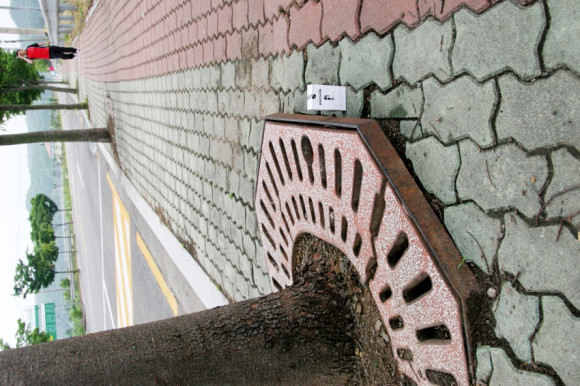 ↑↑ 가로수 보호대가 튀어올라 보행에 불편을 주고 있다.