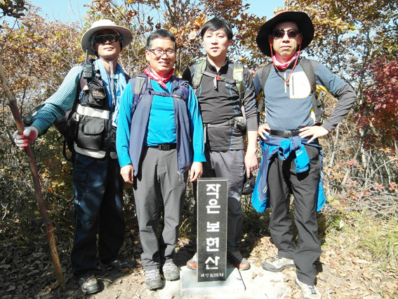 작은보현산 정상(838m)이 눈앞에 나타났다. 앞서간 대원들이 정상 부근에서 휴식을 취하고 있었다. 작은보현산 작은 표석이 나왔다. 대원들은 기념사진을 찍으며 주변 가을 경치를 감상했다. 이때 한 대원은 “표석 뒤 푯말도 포항에 있는 회사에서 세운 것이다”고 말했다. 확인해 보니 ‘세아제강 산악회’(2012년 8월)로 표기됐다. 또 다른 대원은 “누가 세우면 어떠냐 표기만 정확 하면 된다”는 말을 덧붙이기도 했다. 그렇게 생각할 수도 있으나 경계지역 전체를 보면 영천 보다 이웃 지역에서 대부분 경계지를 알리는 표석을 먼저 세웠다(실례 운주산 정상, 금박산 정상 등) .영천은 산 위 능선인 경계지 등산길(낙동정맥, 기맥, 비슬기맥, 팔공기맥 등)을 다른 자치단체 보다 등한시 하는 것으로 해석됐다.