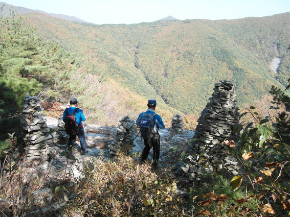 갈미봉 떠나 어느 정도 지나니 구들장으로 유명한 ‘구들장 채석장’이 나오고 구들장을 이용해 돌탑을 쌓아둔 것이 여기저기 보이고 멀리는 보현산 줄기가 보이는 산이 가을 햇살을 받아 황금색을 뛰고 있는 것이 장관이었다. 조망대가 하나쯤 있었으면 금상첨화인 것 같다,