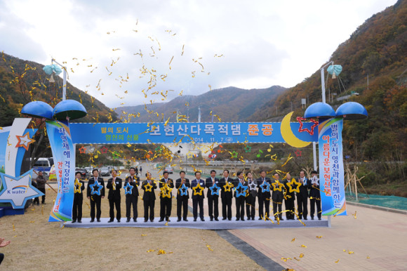 21세기 영천 최고의 명물이 될 보현산 다목적댐이 드디어 완공됐다. 댐 주변에는 최고의 명물인 짚라인을 비롯해 별빛전망대, 오토캠핑장, 물놀이장 등의 다양한 체류형 체험시설이 들어서 새로운 관광자원으로 각광받을 것으로 기대된다. 지난 7일 준공식에 참석한 기관장들이 준공기념 퍼포먼스를 하고 있다.