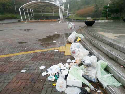 최근 주말을 맞아 영천체육관에서 각종 행사가 끊임없이 열리고 있는 가운데 행사 후 해당 기관단체에서 버리고 간 쓰레기로 몸살을 앓고 있다. 분리수거가 제대로 되지 않은 쓰레기가 월요일 오전까지 치우지 않고 방치돼 주민들의 눈살을 찌푸리게 했다.