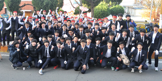 지난 7일 전국적으로 수능시험이 치러졌다. 영천지역 수험생들도 영천고와 영천여고에서 수능시험을 치렀고 시험당일 아침 일찍부터 후배들이 목청을 높이며 수능대박을 기원하는 응원의 메시지를 전달했다. 사진은 영천고와 영동고 후배들이 함께 수험생들에게 힘을 북돋워주고 있는 장면.