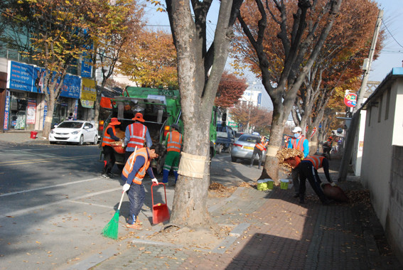 늦가을에 접어들면서 낙엽이 거리를 뒤덮고 있다. 환경미화원들이 총동원돼 바람에 날리는 낙엽을 치우느라 분주하다. 2일에 한 번 낙엽이 많이 떨어진 곳에서 집중적으로 수거하고 있다. 수거량은 하루 600~700kg가량이며 네비엔 소각하고 있다.