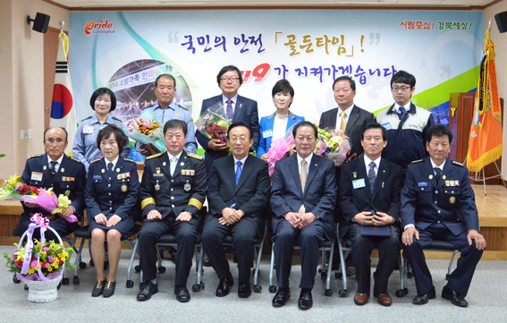 ↑↑ 소방의 날 유공자시상식 장면. 앞줄 중간에서부터 김관용 도지사 김영석 시장 김영수 이사장.