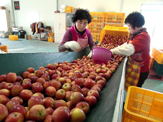 ↑↑ 미니사과를 선별하고 있는 모습.