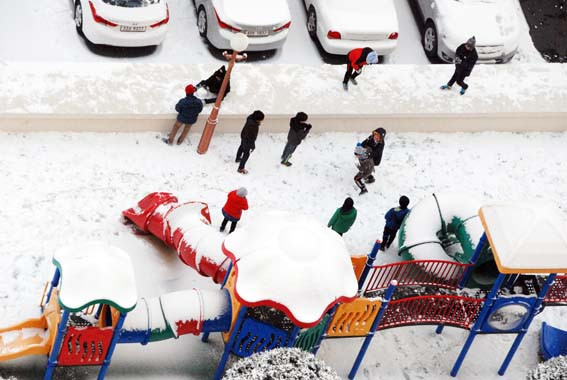 올해 첫눈이 내리자 걱정하는 어른들과 달리 아이들은 아파트 놀이터에서 눈싸움을 하며 신나게 놀고 있다.