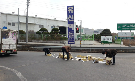 지난 24일 낮 12시경 오미동 영어타운 입구 오미교차로에서 포도즙을 실고 가던 1톤 트럭이 좌회전 하다 포도즙이 도로에 쏟아져 일대 교통이 증체되기도 했다. 처음엔 지나던 차들이 서서 보기만 하고 모두 대기하고 있었다. 지나던 시민들이 나서 쏟아진 포도즙을 주워주고 있는 아름다운 장면이 카메라에 담겼다.