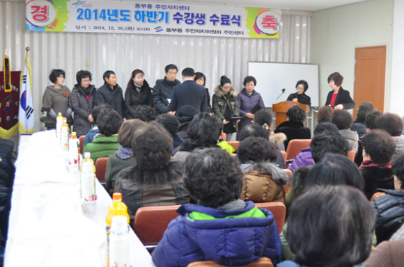 영천시 동부동 주민자치센터는 구랍 30일 2014년 2기 정기강좌 수료식을 개최했다. 지난 5개월간 실시한 필라테스, 요가, 스포츠댄스, 서예, 중국어 등 5개 과정 200여명의 수강생들이 수료했다.