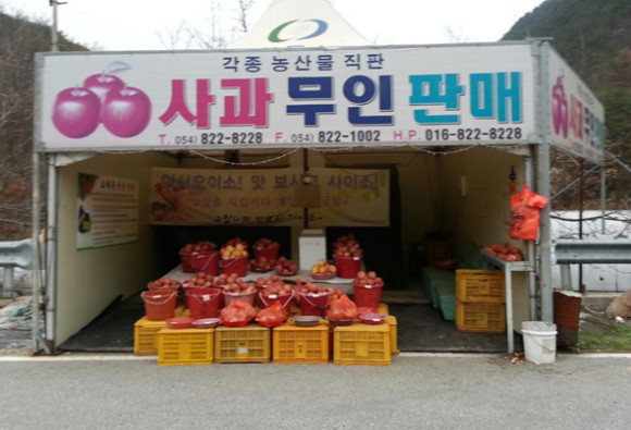 무인판매는 모자라는 인력을 효과적으로 활용한다는 취지에서 시작한 것이며, ‘농산물 무인판매’, ‘무인식당’ 등이 대표적이다. 지역에서도 무인 판매가 가능할까를 두고 현재 무인판매를 실시하고 있는 지역을 다녀왔다. 영천에서 가장 가까운 농산물(사과) 무인판매대인 청송군 길안면 소재의 사과무인 판매대를 찾았다.