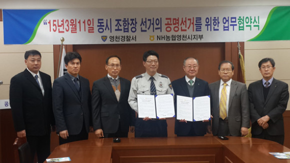 영천경찰서(서장 정우동)와 NH농협영천시지부(지부장 이세환)는 지난 4일 농협시지부에서 3월 11일 치러지는 전국동시 조합장 선거의 공명선거를 위한 업무협약식을 가졌다.
