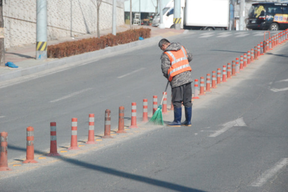 제설용으로 뿌려진 모래가 바람에 날리면서 주민들에게 불편을 주고 있다. 환경미화원이 도로 위에 남은 모래를 빗자루로 쓸어 담고 있지만 별다른 효과를 보지 못하고 있는 실정이다. 지난해 12월에는 5차례(8일 120㎥, 20일 108㎥ 21일 8㎥, 22일 8㎥, 31일 72㎥)에 걸쳐 316㎥ 모래가 도로위에 뿌려졌다. 금액으로는 1700만원 상당이다. 시 도로담당은 “인력으로 청소하는 것은 한계가 있다”며 “3월경 청소용 차량을 임차해서 대대적으로 도로청소를 실시할 계획이다”고 말했다.