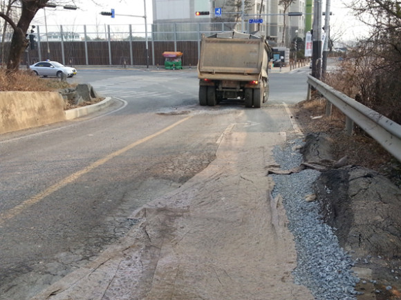 도로가 누더기로 변했다. 한신아파트 공사현장 바로 입구 도로는 패이고 떨어지고 튀어나오는 등 그야말로 수난시대를 겪고 있다. 공사 담당자들은 현장을 여러차례 보수하고 정비했으나 25t 트럭이 하루 수백 대씩 다니는 것을 감안하면 역부족이다. 행정에서는 이 일대 도로를 잘 점검하고 시민들의 불편을 최소화해야 한다.