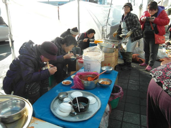 영천장 노점에는 명물이 여러 개 있다. 그중에서 가장 으뜸인 명물이 수덕예식장 건너편 노점에서 판매하는 2000원 국수가 아니가 싶다. 2명의 아주머니(주인)가 말아주는 국수는 새벽부터 장 마치는 시간까지 쉴 새 없이 팔린다. 간장과 김치뿐이라도 손님들은 항상 만원이다. 주인 아주머니에 ‘장날 2~300 그릇 판매하느냐’고 물으니 “그 정도론 밥 못 먹고 산다”고 해 많은 량을 판매하는 것 같았다.