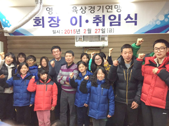 ↑↑ 지역 육상꿈나무들과 신임회장이 화이팅을 외치고 있다.