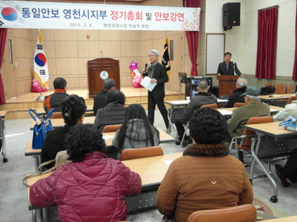 통일안보 영천시지부(지부장 김영우) 정기총회 및 안보강연이 지난 8일 오전 영천공설시장내 만남의광장에서 60여명의 회원과 관계자들이 참석한 가운데 열렸다.
