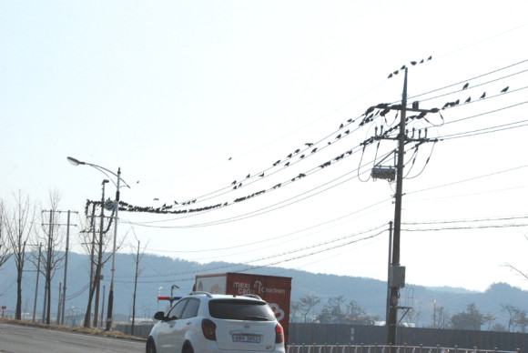 조교동 단포교 앞 전봇대에 까마귀 수천마리가 내려앉아 있다. 영천에서 까마귀가 떼 지어 앉아 있는 모습은 찾아보기 어렵다.
