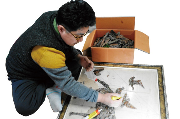 그는 모든 재료를 소나무에서 얻는다. 떨어진 소나무 껍질과 솔방울 그리고 솔잎을 산책삼아 주워와 밑그림을 그리고 하나하나 본드로 붙여 형태를 잡은 후 니스를 칠해 마무리 한다.