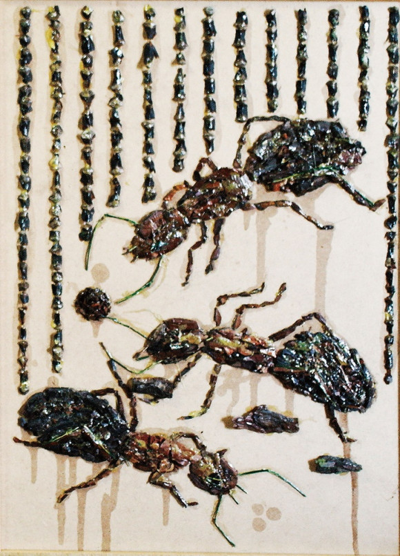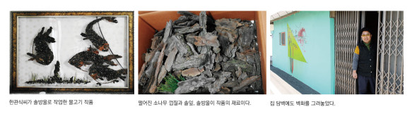 “그림은 어릴때부터 소질이 있었어요. 그래서 제 소설이 신문에 연재될때는 삽화를 직접 그리리도 했었죠. 하지만 이 작업은 재료의 특성을 잘 알아야 하잖아요. 나무 부스러기와 속껍질, 솔방울, 솔잎 등 재료들을 어떻게 활용하느냐에 따라 그림의 명암과 색체의 소소한 변화를 캐치해 낼 수 있어요.”