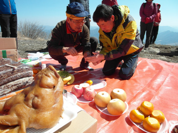 | | | ⓒ 영천시민뉴스 | | 시루봉에 도착해 올해 탐사대의 ‘무사안녕’ ‘산불예방’ 을 기원하는 시산제를 준비하고 모든 대원들은 정숙한 마음으로 시산제 참여했다. 초헌관은 김성근 대장, 아헌관은 김영모 전 대장, 종헌관을 최기문 전 경찰청장이 맡아 차례로 절을 올리고 마음속 소원을 빌었다.