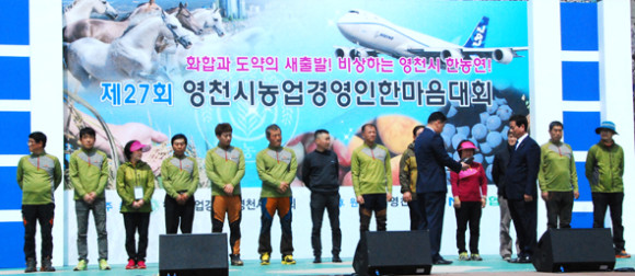 | | | ↑↑ 기념식에서 우수회원에 대한 표창을 전달하고 있다. | | ⓒ 영천시민뉴스 | | 영천시농업경연인 한마음대회가 지난 10일 영천강변공원에서 개최됐다. 올해로 27회째를 맞이하는 이번 대회에는 정희수 국회의원, 김영석 시장, 권호락 시의장을 비롯한 시의원, 한혜련·김수용 도의원, 이세환 농협영천시지부장 등 농업관련 각 기관단체장이 대거 참석해 축하했다.