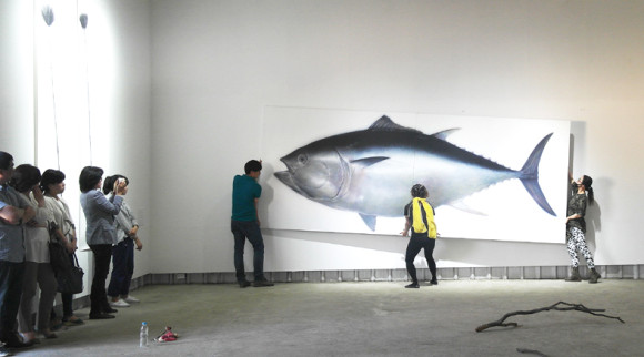 ↑↑ 작품의 창작과정과 전시과정을 표현하고 있는 '썬-자이언트'전 오프닝 퍼포먼스