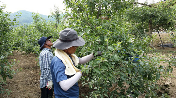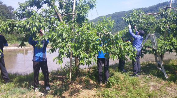 이날 일손돕기에는 직원 13명이 참여해 이른 아침부터 죽전리 농가에서 적과작업을 위해 적과방법을 교육받고 작업했다. 특히 손이 많이 가는 사과 등을 재배함에 따라 해마다 일손이 부족해 애를 먹고 있는 실정이다.