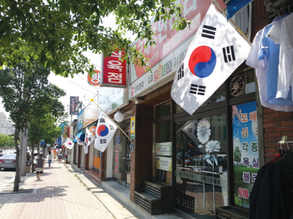 현충일 조기를 다함께 게양한 무궁화상가 태극기가 힘차게 펄럭이는 모습이 아름답게 보였다. 무궁화 상가 상인들은 매번 국기 게양일에는 다함께 국기를 게양하는 단합을 과시해 오고 있어 모범이 되고 있다.
