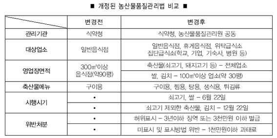 최근 개정된 농산물품질관리법의 주요내용을 살펴보면 식약청과 농관원이 공동 관리기관으로 지정됐으며, 기존 300㎡이상 일반음식점 범위로 실시하던 것을 축산물(쇠고기, 돼지고기 등)에 대해서는 전체업소가 원산지표시를 실시, 추가로 쌀과 김치에 대해서는 100㎡이상 휴게음식점, 위탁급식소, 집단급식소(학교,기업,병원 등)에도 원산지표시제를 의무화했다.