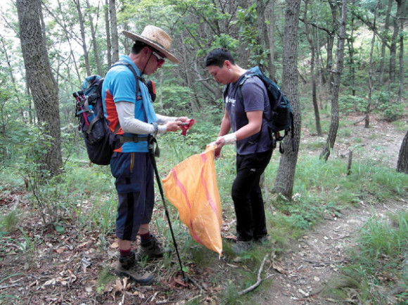 이상훈 대원과 김성근 대장은 쓰레기 줍는 마대를 가지고 다니며 크고 작은 쓰레기를 마대에 계속 담으며 나갔다.