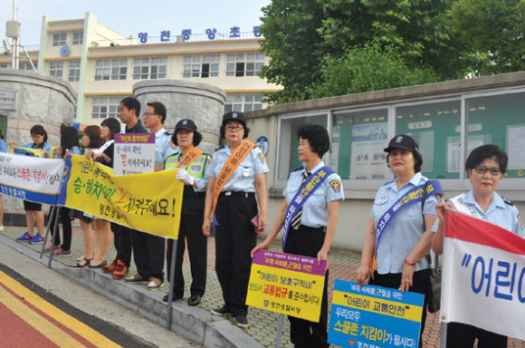 지난 14일 영천중앙초등학교 정문에서 영천교육지원청과 영천시청, 영천시 녹색어머니회와 자율방범대가 연합으로 ‘어린이 통학로 확보를 위한 등굣길 교통 캠페인’을 실시했다.