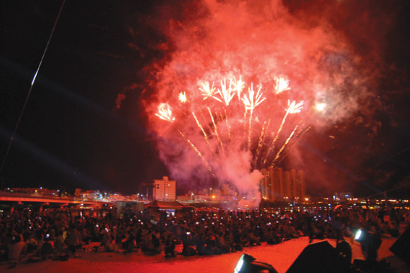 무더운 영천의 여름밤 하늘을 화려한 불꽃으로 수놓으면서 무더위를 날려버렸다. 영천청년상우협의회와 공무원노조 영천시지부는 지난 25일 금호강 생태하천 음악분수 광장에서 강변영화제를 앞두고 화려한 불꽃쇼를 선보였다.