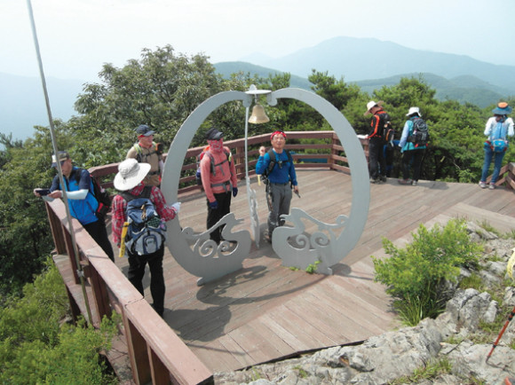 봉좌산 정상에는 경치 보는 곳과 바로 밑에 종을 만들이 설치했다. 대원들은 종을 치며 사진을 찍었는데, 표정이 모두 즐거웠다.