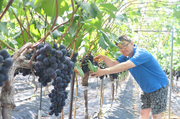 | | | ↑↑ 신길호씨가 거봉을 수확하고 있다. | | ⓒ 영천시민뉴스 | | 신길호씨는 9900㎡(3천평)의 밭에 거봉을 키운다. 무더위가 기승을 부리는 한여름, 수확을 위해 들어선 포도밭에는 검은 진주같은 포도알이 주렁주렁 달려있다. 12년간 포도농사에 매달려 노력한 결과, 2년 전에는 조수익 1억2천을 얻었고, 포도작황이나 가격이 좋지 않았던 지난해에도 1억원의 매출을 올린 진짜 포도쟁이다.