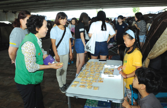↑↑ 이춘자 부녀회장이 학생들이 판매하는 쿠키를 구매하고 있다.