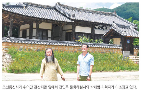 ↑↑ 조선통신사가 쉬어간 관산지관 앞에서 전민욱 문화해설사와 박재범 기획자가 미소짓고 있다.