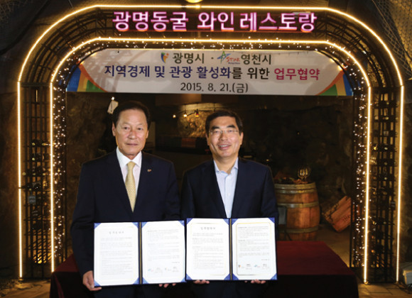 영천시(시장 김영석·사진 좌)와 광명시(시장 양기대)가 광명동굴과 연계한 지역경제와 관광활성화를 위한 업무 협약식을 지난 21일 광명시 광명동굴 내 와인레스토랑에서 가졌다.