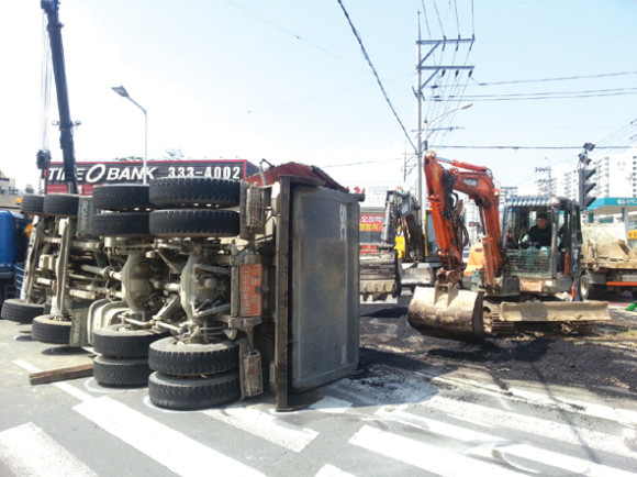 덤프트럭 전복… 차량정체